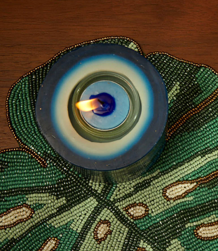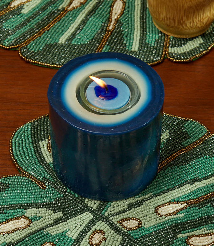 The scented candle is dyed in shades of blue to recreate an evil eye in wax. The beautiful blue wax scented candle has both an aroma and a color palette that elevates up the décor of any room. This decorative candle has a separate inbuilt tealight holder – making it a very sustainable choice. The deep indigo blue of the outer layer fades into lighter shades at the center, making it a very elegant home décor candle. This wax candle is hand poured to achieve this beautiful shaded effect. Use this natural handmade candle for home décor to create a soothing ambience. The light fragrance from this blue evil eye candle is a stress reliever. Give the gift of beauty with this fragrant wax candle.