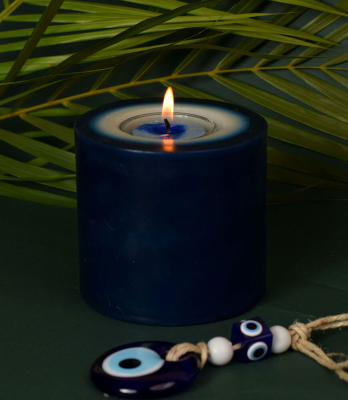 This blue evil eye scented candle looks stunning as a table décor. This large candle is perfectly colored and proportioned to resemble an evil eye. Create a bold elegant ambience with this blue dual toned pillar candle. The tealight set inside is disposable – so you may reuse this candle to light up your life for a very long time.